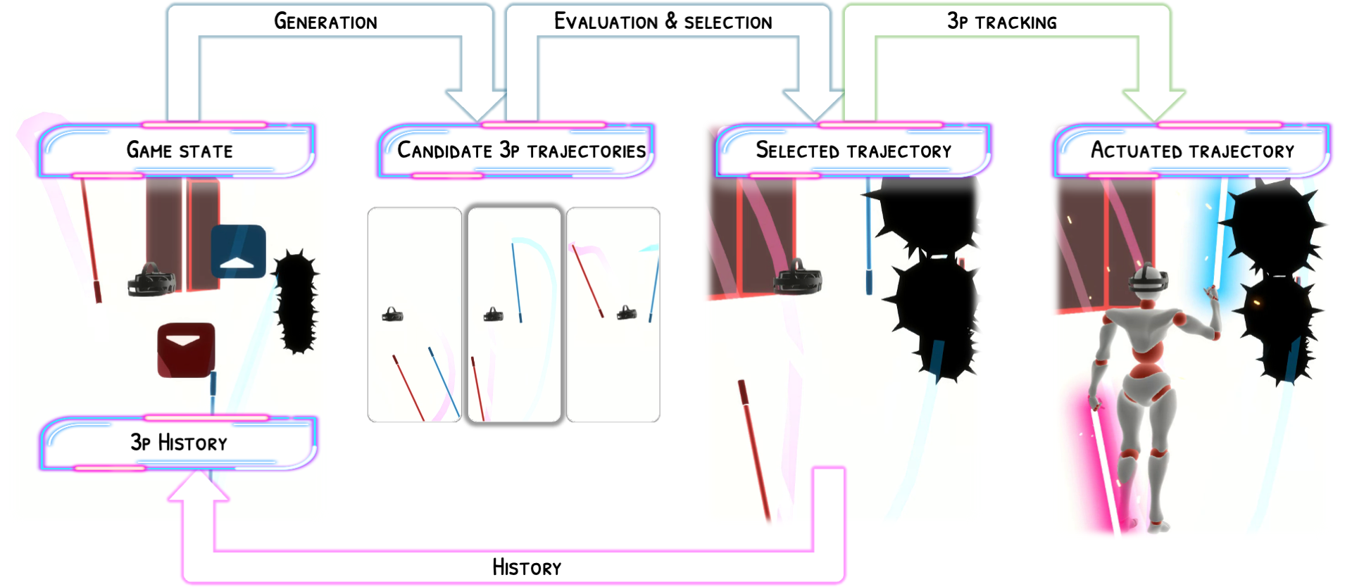 Robo-Saber follows a generate–simulate–select pipeline. A reference-conditioned generative model samples multiple candidate 3p trajectories. Each candidate is then evaluated using TorchSaber, a custom GPU-accelerated Beat Saber simulator we develop. The highest-scoring trajectory is selected and fed back autoregressively, producing minutes-long gameplay sequences on entirely new maps. The generated 3p trajectories can optionally drive a physics-based full-body tracking controller (PHC, Luo et al., 2023), fine-tuned on custom Beat Saber motion capture data, for whole-body gameplay simulation.